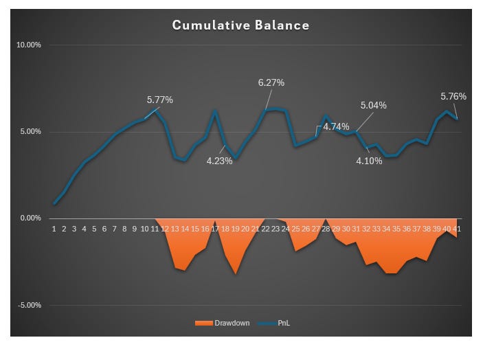 9 trade ile yoğun bir hafta, toplamda pozisyon bazında 83% kârla kapanmış. Toplam bakiye bazında %1.6’ya denk geliyor. Son bir kaç haftaki durgunluktan sonra makul bir çıkış. Bir kaç haftadır marketler de hareketli değildi. Bu strateji sadece market hareketlendikçe kazanıyorsa, hareketsiz market için başka strateji kurmak gerekebilir.