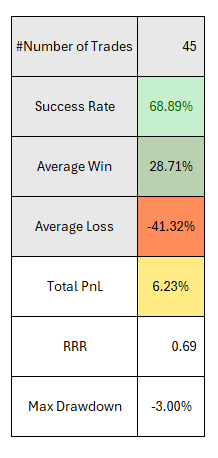 Toplam sinyal sayısı 45 oldu. Strateji ile ilgili fikir vermesi açısından kafi. Bu stratejiyi bu şekilde kayda geçirmeden önce de uzun zaman trade ediyorum. Sinyal sayısı bu kadar az değildi. Marketin bu aralar pek aktif olmadığı görülüyor. Dünyada şu anda yaşanan olaylarla ilgili olabilir.