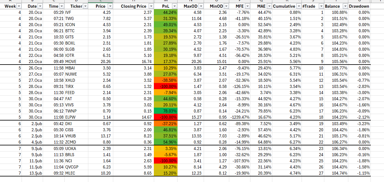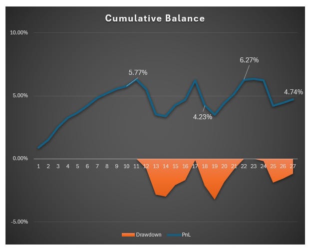 Grafikte gözüken yüzdeler her haftanın sonundaki bakiyenin kârı. İlk haftaki çıkıştan sonra ivme devam etmedi, ancak bu gayet normal. 4 haftada %4.74 kâr hala çok iyi, ama hep belirttiğim gibi, önemli olan sürelilik.