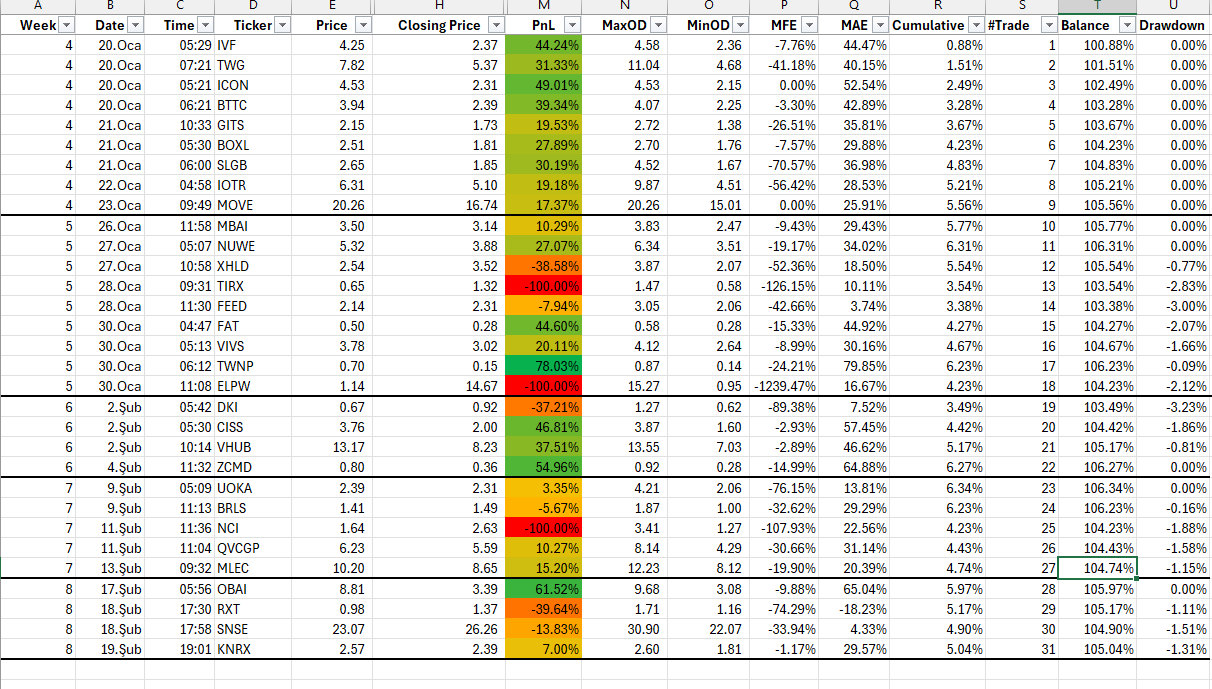 Sekizinci hafta yalnızca 4 pozisyon ile aktivite gene düşükmüş. Haftanın ilk günü sinyal yoktu. Son günü de seyahatten ötürü Trade Ideas’ı ne yazık ki açamadım. Bu şekilde 3 günde 4 trade gelmiş oldu.