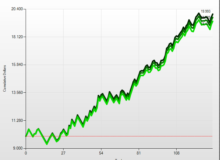 Pozisyon başına risk 20%. Bunun dolar bazında ne kadar olacağı kişisel olarak belirlenmeli. 1000 dolarlık bir pozisyonda 200 dolar riske edilir. 10000 dolarlık bir bakiyede bu pozisyon başına risk %2’ye denk gelir. Ben testimi bu değerler ile yaptım. Pozisyon başına riskin ne kadar olması gerektiği hem kişisel seçimle hem de stratejinin uzun vadeli performansına göre belirlenmelidir.