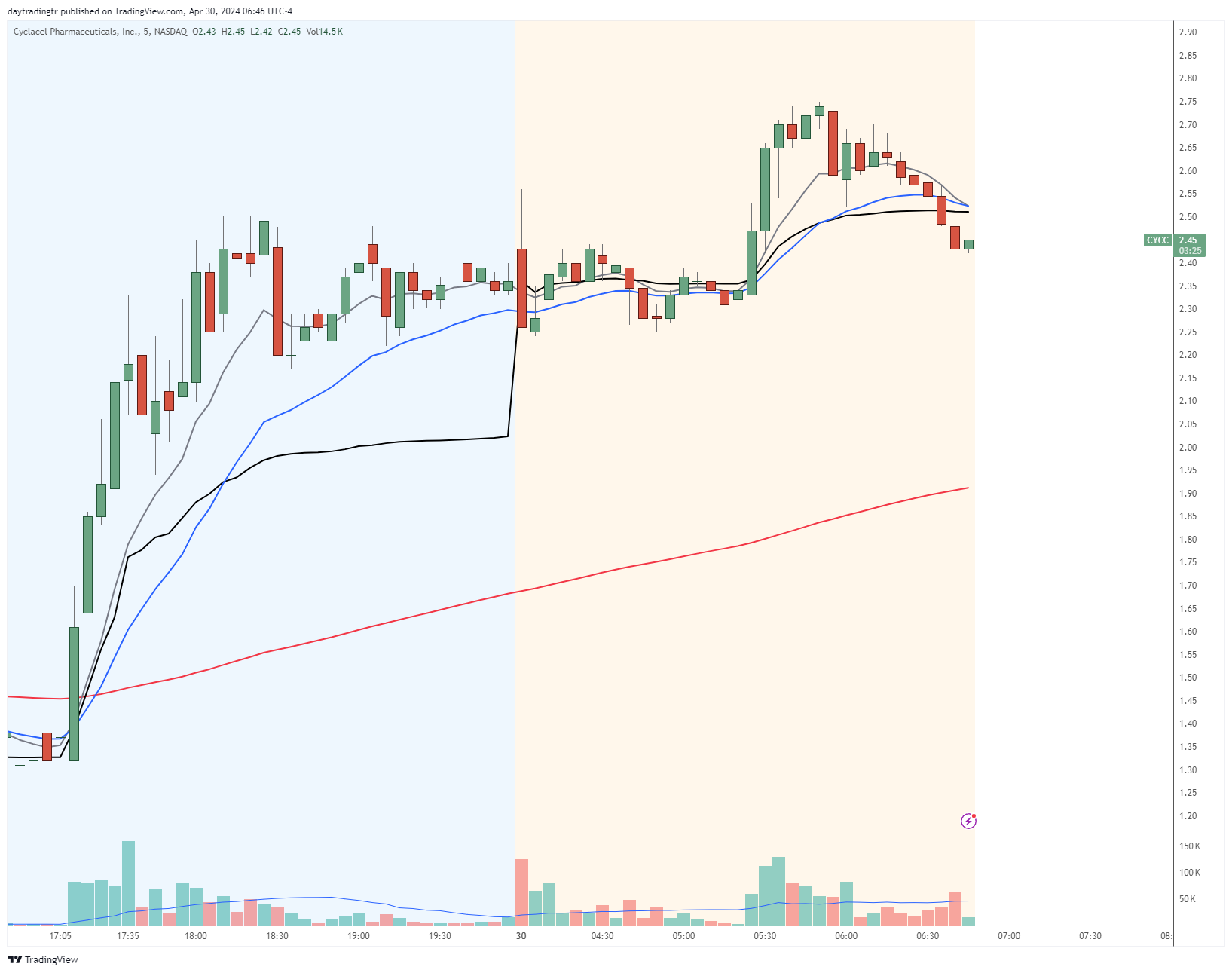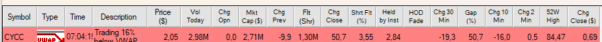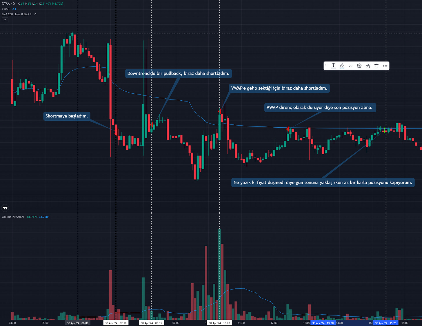Kazanan tradeleri paylaşmak aslında çok zevkli, ancak gerçekte hep kazanılmadığı için istediğim gibi hareket etmeyen tradeleri paylaşmayı daha çok tercih ediyorum. 30 Nisan 2024 tarihinde CYCC hissesindeki premarkette başlayan (lokal saat 07:14) ve neredeyse kapanışa(lokal saat 15:24) kadar devam eden pozisyonu aşağıda görebilirsiniz. Sağ tıklayıp yeni sekmede açıp yorumları daha rahat okuyabilirsiniz.