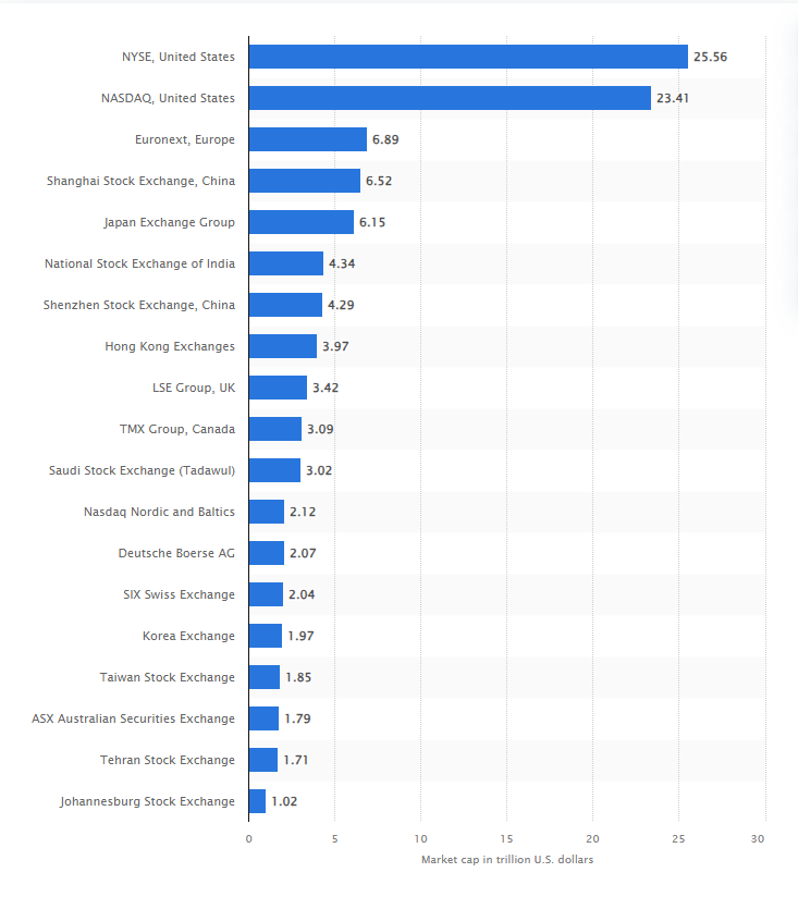Yukarıdaki grafikte aynı ülkeden farklı borsaları görebiliyoruz. İlk ikisi NYSE ve NASDAQ, ABD menşeli borsalar. Bu ikisi Day Trading Turkey’de bahsedilen hisse senetlerinin bulunduğu borsalar. İçerisinde bulunan şirketlerinin piyasa değerleri toplamı itibariyle dünyadaki en büyük iki borsa. Bu büyüklük sayesinde en çok trade edilen hisse senedi borsası da oluyorlar.
