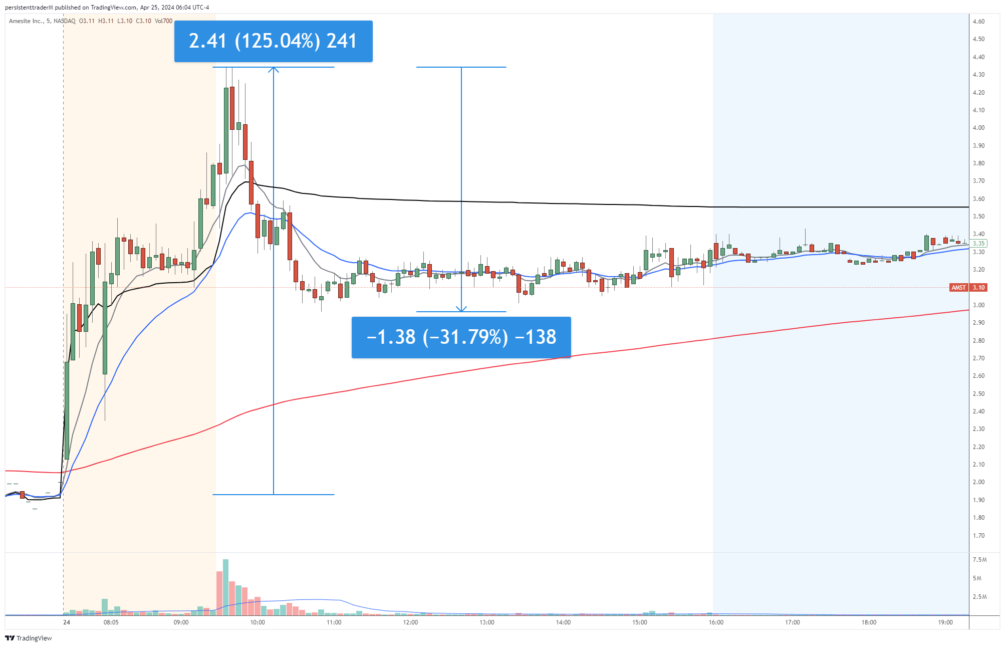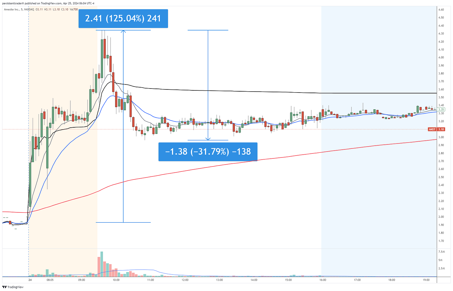 AMST hissesi premarketten itibaren %125 artmış ve sonrasındaki %32’ye yakın geri düşmüş. Bu hissenin Trade Ideas’a göre (her zaman ikinci bir kaynaktan teyit etmekte de fayda var) yukarıda açıkladığım değerleri şöyle;