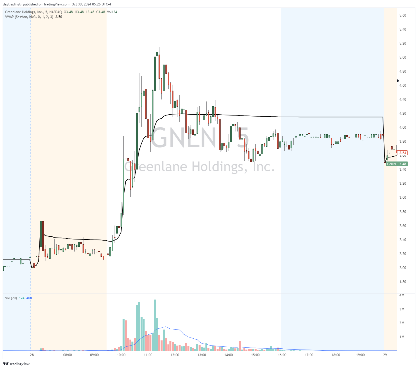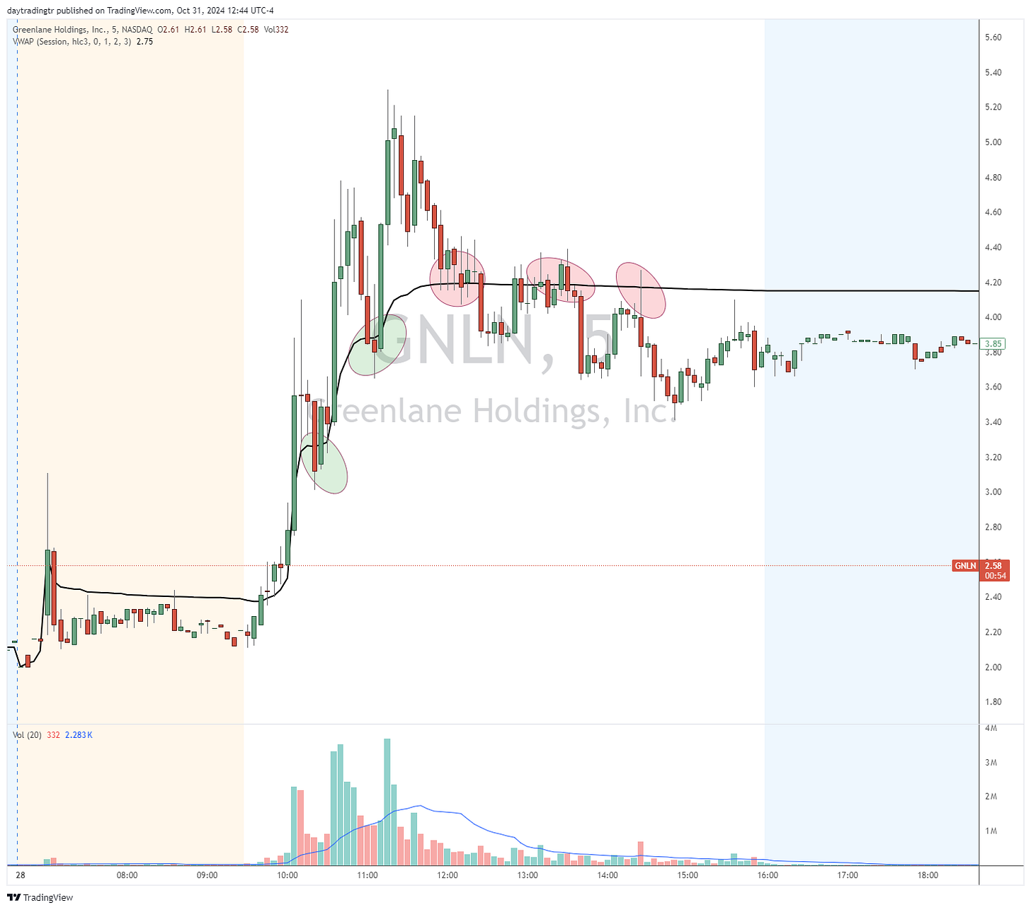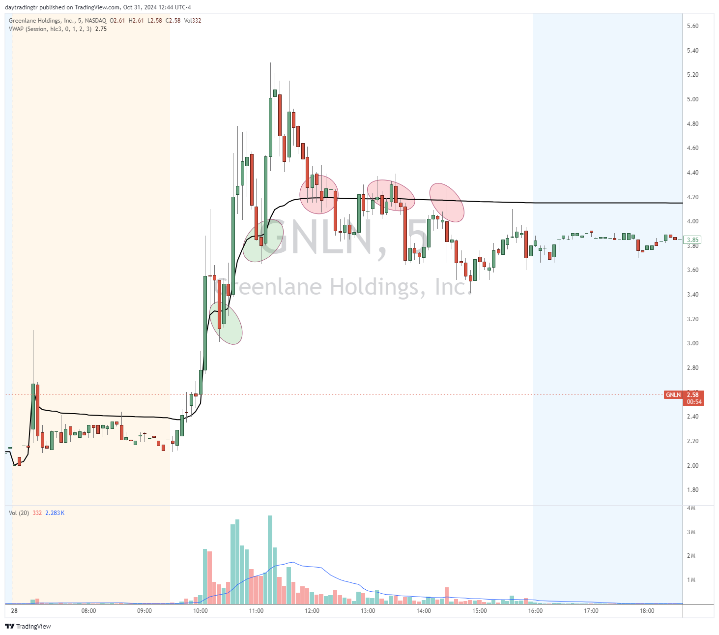 Aşağıda GNLN hissesinin 28 Ekim 2024 tarihindeki 5 dakikalık mum chartını VWAP ile beraber görülebilir.