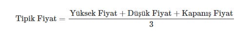 Tipik Fiyat (Typical Price), zaman dilimindeki en yüksek, en düşük ve kapanış fiyatlarının ortalamasıdır: