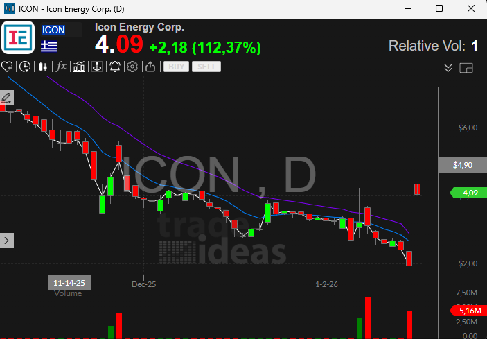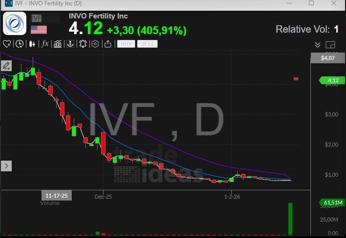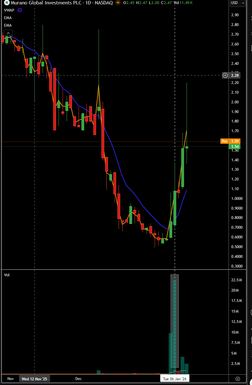 1, 2 ve 3 numaralı kurallar gayet açık. 4. kural bahsettiğim gibi hissenin o gün enaz %100 artmış olmasını şart koşuyor. 5 ve 6. kurallar da son 10 ve 30 dakika içerisinde fiyatın artmadığını belirtiyor. 10 veya 30 dakika içerisinde artış olsa bile tekrar düşmüş olması gerekiyor. 7. kural da açık, belirtilen saatler arasında gelen sinyallerin kazançlı olduğu istatistiksel olarak görülmüş o nedenle bu saat aralıklarına bağlı kalıyoruz. 8. kural biraz karmaşık gözükebilir. Bu hisseler zaten o gün içerisinde aktif olan herkesin gözünün üzerinde olduğu hisseler oluyor. Benzer aktifliği bir önceki 8.5 gün içerisinde olmuş ve orada bir tepki oluşmuşsa bu hisseleri shortlamamak daha kârlı olduğu istatistik göstermiş. Bu aktifliği de göreceli olarak çok yüksek hacimli bir günde görebiliriz. Aşağıdaki örnekte MRNO hissesinin 8 Ocak 2026 tarihine kadarki günlük grafiği gözüküyo. Bu hisseyi 9 Ocak 2026 tarihinde trade etmek isteseydik, 6 Ocak 2026 tarihinde de yüksek hacimli bir gün olduğunu görüp elememiz gerekirdi.