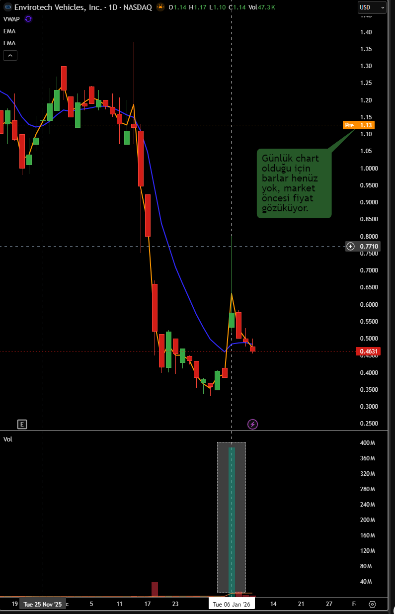 Başka bir örnek olarak; aşağıdaki EVTV hissesini 12 Ocak 2026 tarihinde trade ediyor olsaydık, 6 Ocak’taki olağan dışı hacmi görebilirdik.