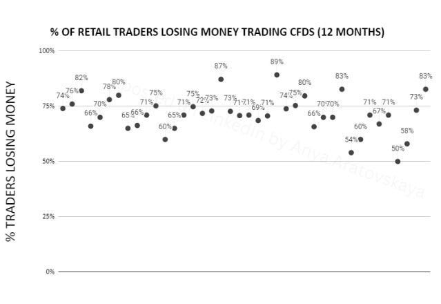 Avrupa Birliği’nin menkul kıymetler piyasaları düzenleyicisi olan Avrupa Menkul Kıymet ve Piyasalar Kurumu (ESMA) bu kuruma bağlı aracı kurumların kazançlı hesapların oranını açıklamayı şart koşuyor. Bu raporlara göre kaybeden hesapların ortalaması %70 ve %80 arasında değişiyor (What retail traders losing-money 2023, Retail broker clients profitability reloaded a year into esma). Ancak bu oranın daha yüksek olduğunu varsayabiliriz, zira bunlar yalnızca hala açık ve aktif hesaplar, kapatılan hesaplar bu orana dahil değil. Kapanmış hesapları da eklersek oran kesinlikle yükselecektir.